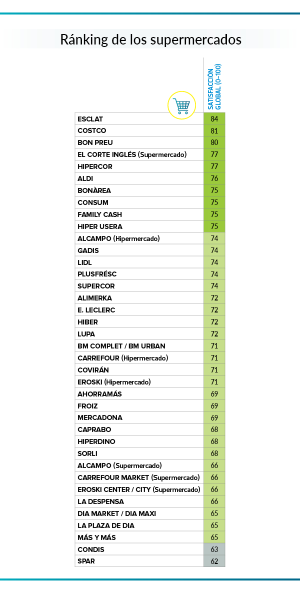 Las promociones también juegan un papel importante, y Esclat, Costco y Carrefour son los favoritos en este aspecto, mientras que Mercadona queda rezagado. En cuanto a la espera en caja, Esclat, Plusfrésc y Bon Preu son los más valorados, mientras que los menos satisfechos compran en Lidl y Sorli.